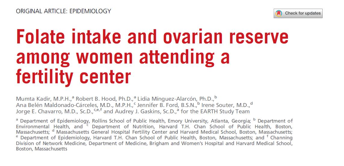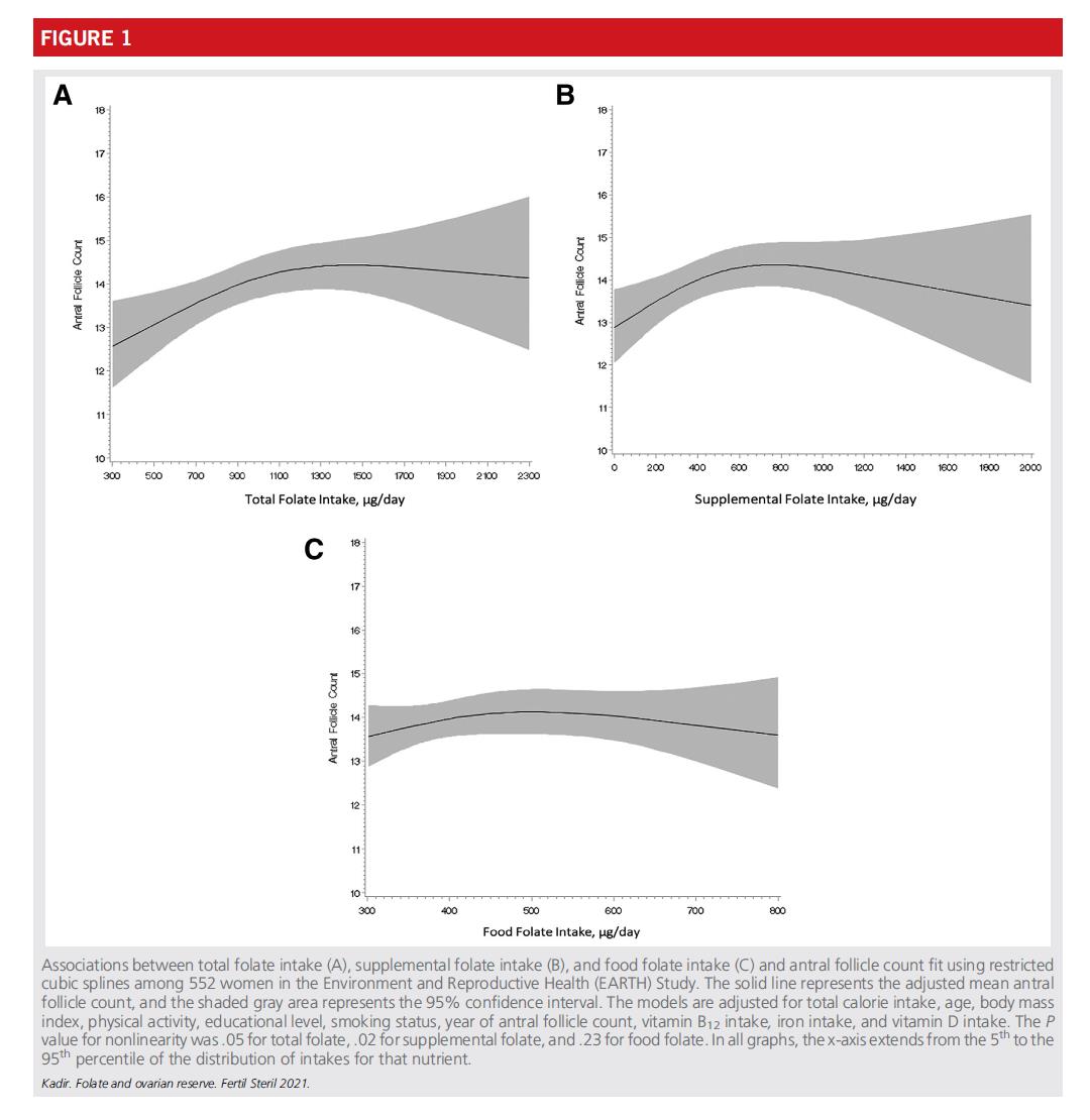 Diese Studie analysierte Daten von 552 Frauen, die das besuchten Schwerpunkt: Massachusetts General Hospital Fertility Center in den Vereinigten Staaten über den Zusammenhang zwischen Folsäureaufnahme und Eierstockreservefunktion (gemessen durch Antral Follicle Count, AFC).