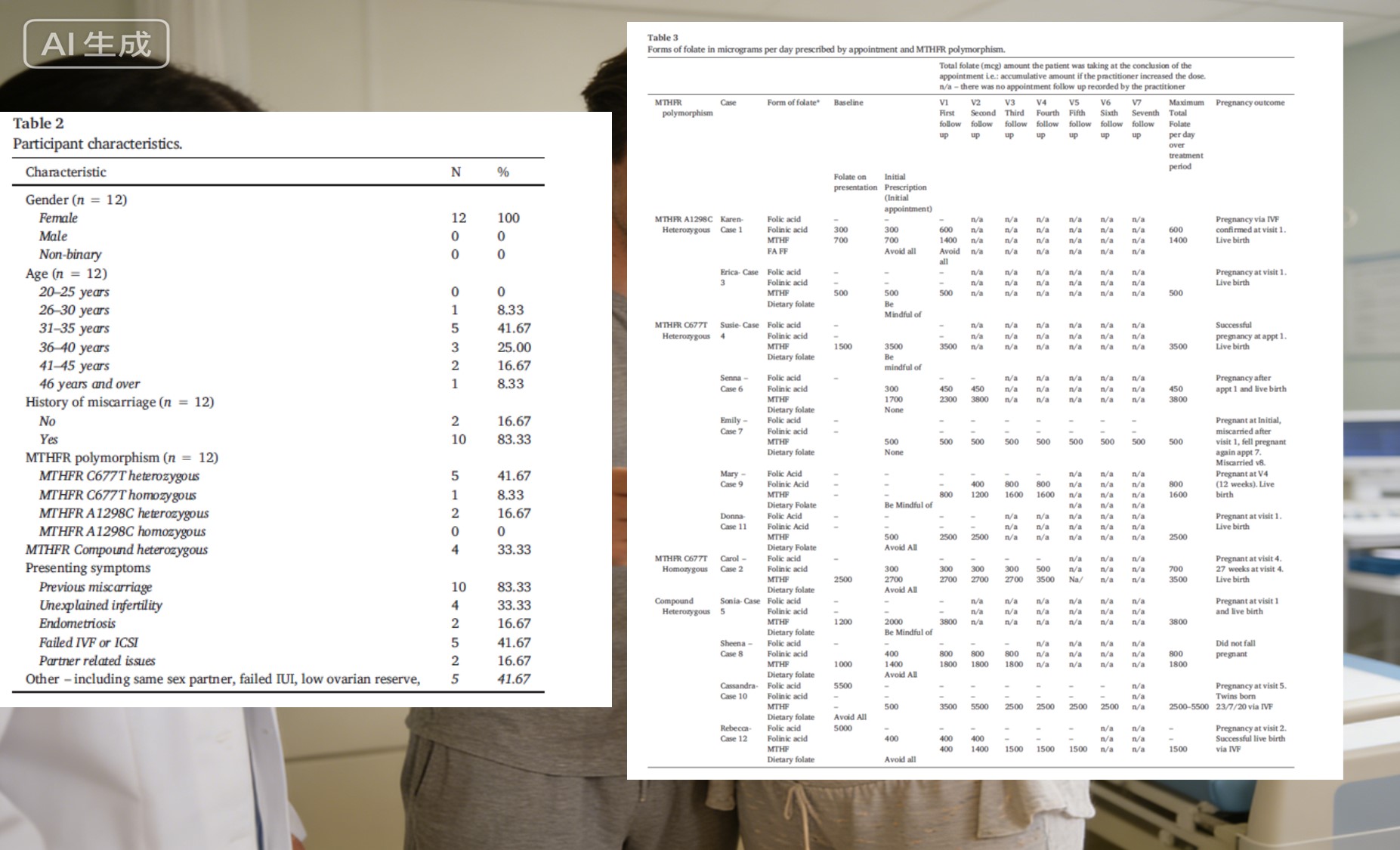 Die Studie umfasste 12 Patienten, von denen 83,3 % eine Fehlgeburt in der Vorgeschichte hatten und 41,7 % hatten fehlgeschlagene assistierte Reproduktionszyklen erlebt. Alle waren diagnostiziert mit MTHFR-Genpolymorphismus (am häufigsten C677T heterozygot, zusammengesetzt heterozygot usw.). Für diese Frauen ist jeder Schwangerschaftstest negativ war mehr als nur eine Zahl – es repräsentierte emotionale und körperliche Erschöpfung. Es wurde dringend notwendig, einen wirklich passenden Ernährungsplan zu finden.