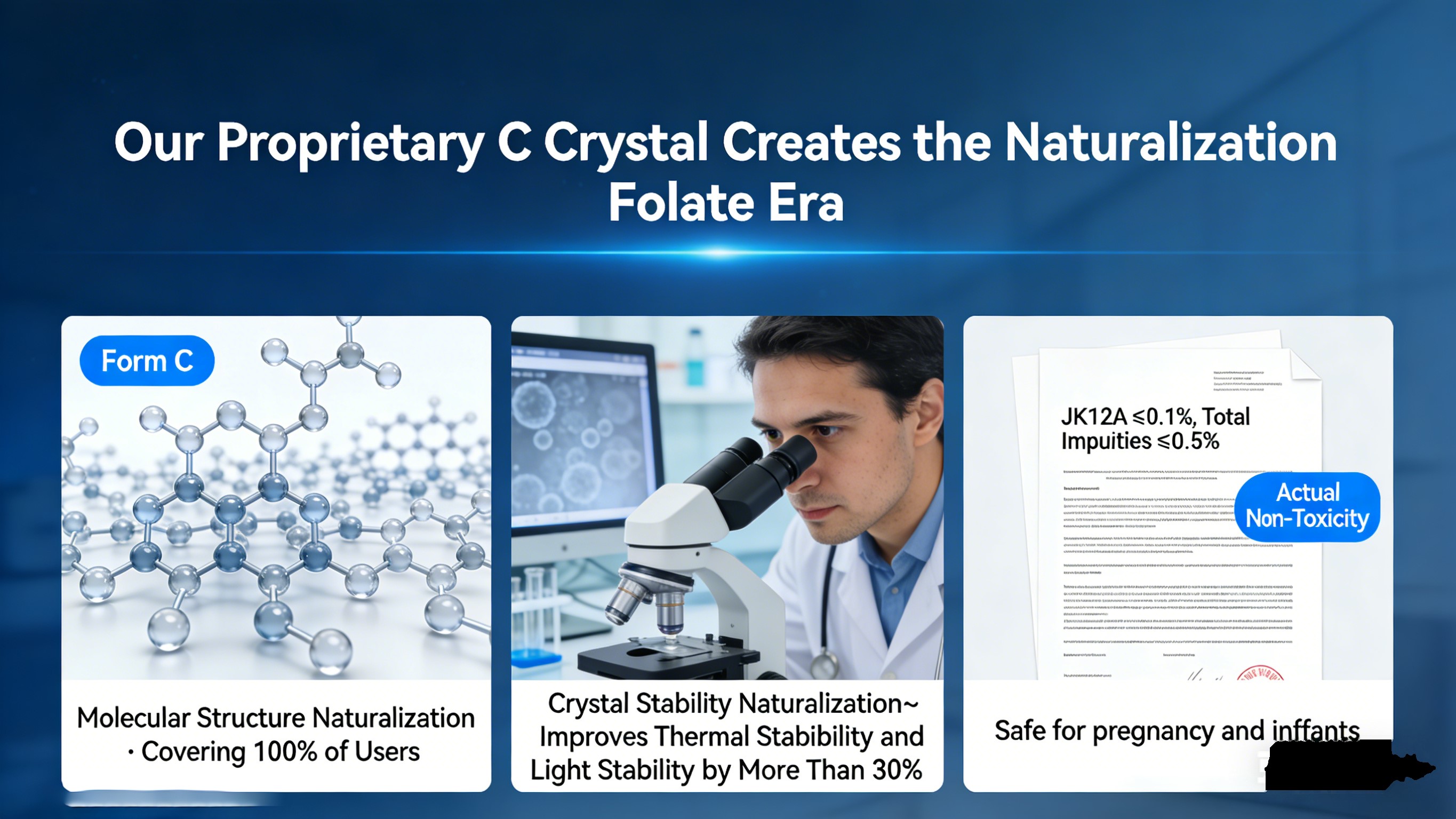 Basierend auf unserem C-Kristall-Patent haben wir Pionierarbeit geleistet Kategorie „Einbürgerung von Folsäure“ und erhält die erste globale Zertifizierung. Stimmt Die Einbürgerung von Folat erfordert eindeutig die Erfüllung von drei Kernkriterien Unterscheidung von generischem aktivem I-Kristall-Folat: