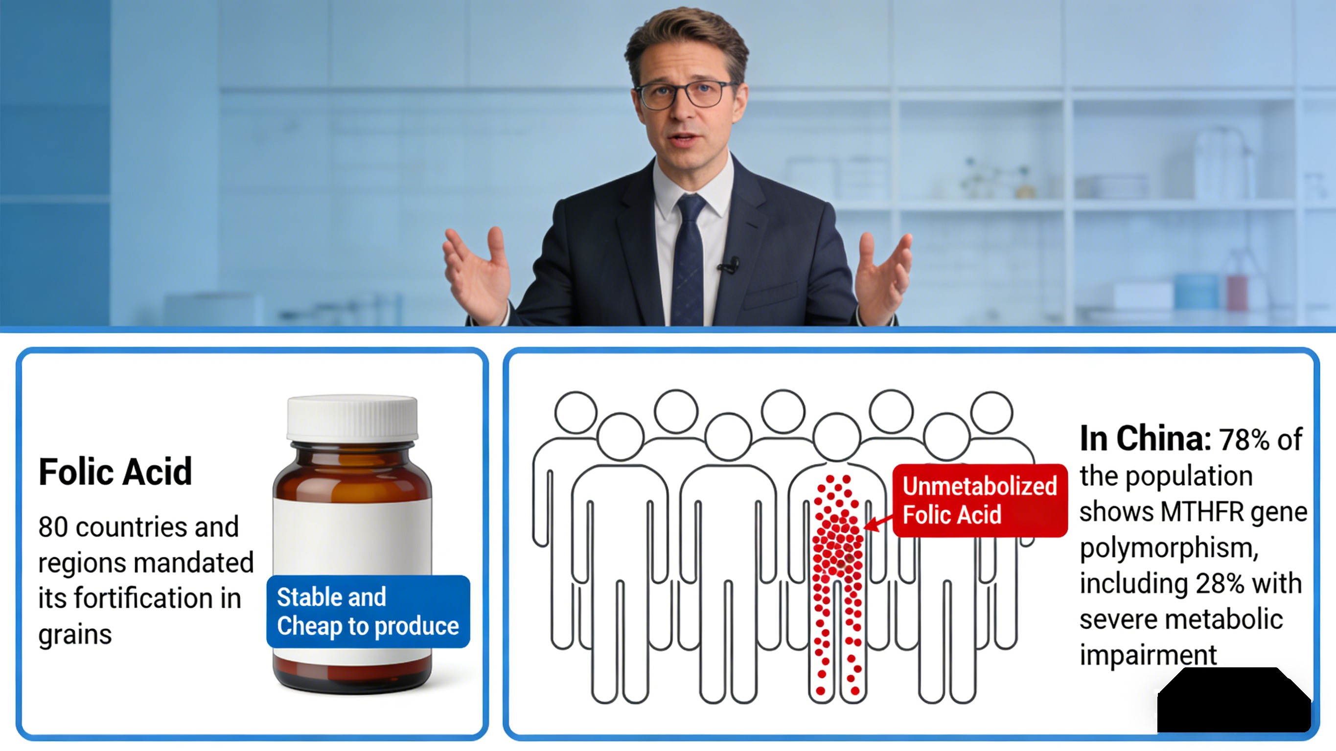 In der Praxis fast 30 % der Chinesen Folsäure kann nicht effizient umgewandelt werden, was zu einer unwirksamen Nahrungsergänzung führt und mögliche Ansammlung von nicht verstoffwechselter Folsäure, die einen Vitamin-B12-Mangel verschleiern kann und beeinträchtigen die Zinkaufnahme. Für Unternehmen bedeutet dies: Verbraucherbeschwerden und Reputationsrisiko.
