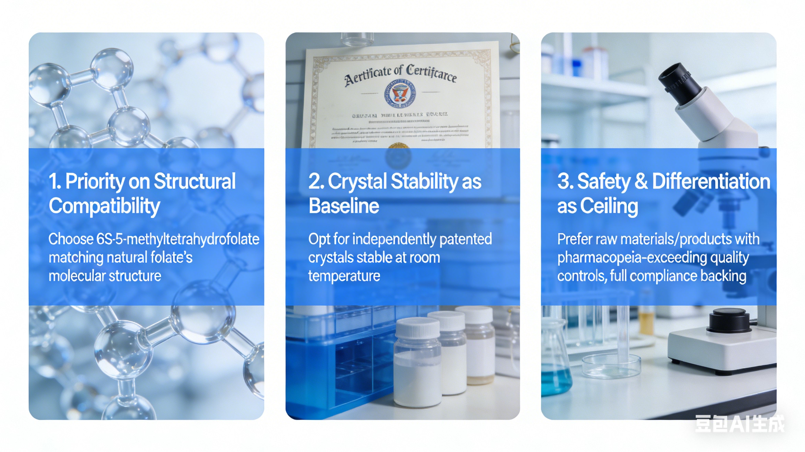 1. Priorität auf strukturelle Kompatibilität: Wählen Sie das passende 6S-5-Methyltetrahydrofolat Die molekulare Struktur von natürlichem Folat – direkte Absorption, deckt alles ab Benutzer, verhindert Unwirksamkeit.2. Kristallstabilität als Basislinie: Entscheiden Sie sich für unabhängig patentierte Kristalle stabil bei Raumtemperatur, um die Chargenkonsistenz und die Etikettenaussage sicherzustellen Compliance.